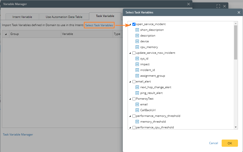 Note: Only the task variables selected on the Task Variables tab can be used in intent diagnosis. And such task variables can be called in home intent and all its follow-up intents where the variables are used. - Click OK after selecting the task variables.