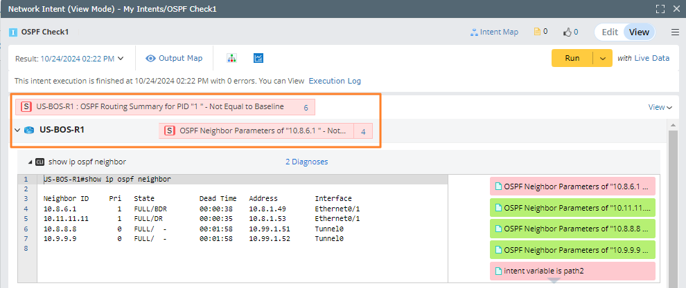 R12 Publication-2025July16 View Intent Status Code Status code describes NI execution results (Alert or Success) and it can be displayed at the intent level and device level.Display Status Codes from Follow-up Intents TogetherClickable Status Code Access Diagnosis Tree Display Status Codes from Follow-up Intents Together