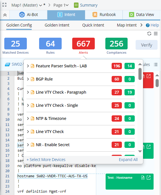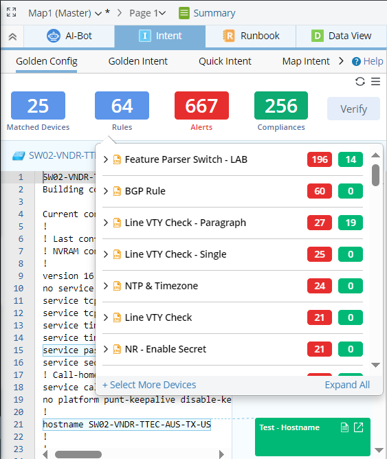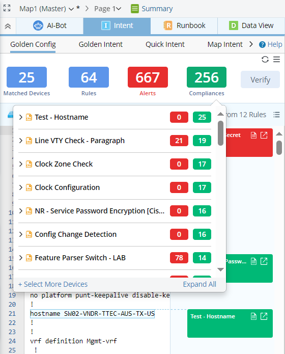 Note: The tip window from Alerts block will only list the golden config rules and devices that generate at least one alert. - For Compliances block, information is organized by rules with success result. Under each rule, devices matched with the rule and the golden check results for each related device are listed.