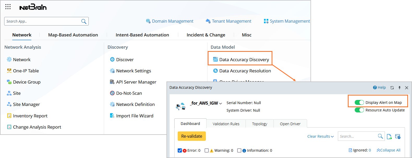 On the NetBrain map, if devices on the map have alerts from System Validation or Platform Validation, the corresponding hostnames will be highlighted with an alert icon. The color red indicates errors.