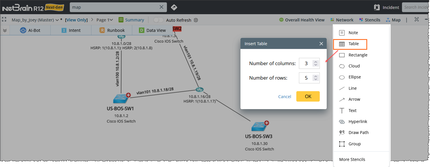 Upon choosing the Table from Stencils menu, adjust the numbers for columns/rows in the popped-up window Insert Table and click OK to add table on the map.