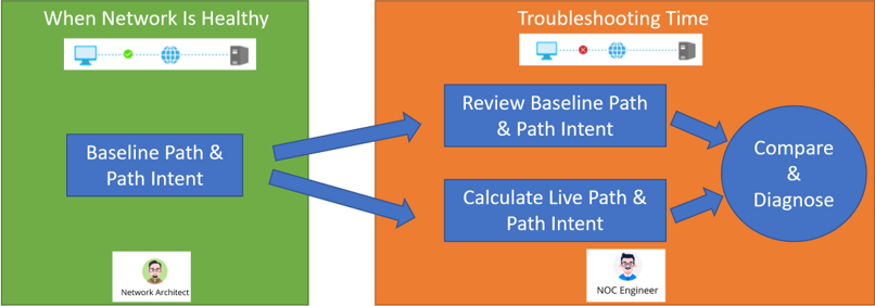 During troubleshooting, users can recalculate live paths and compare paths between live and cached data to reveal various issues behind a slow application. - Execute Path Intent and Diagnose Issues (during troubleshooting)