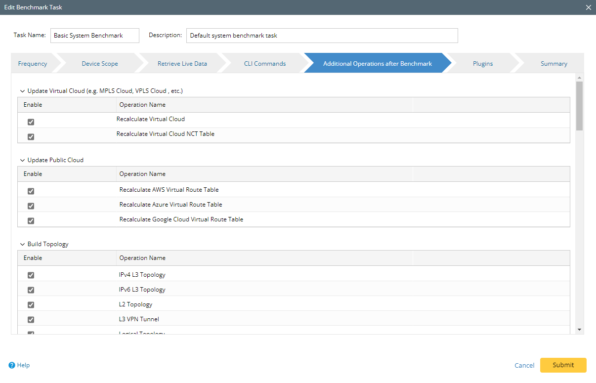 - Update MPLS Cloud: Select both options Recalculate Cloud and Recalculate Cloud NCT for Basic System Benchmark if there is MPLS Cloud in your network. Sometimes large MPLS Cloud takes a long time to rebuild, and you can create an individual Benchmark task with less frequency to rebuild them. See <hyperlink to Best Practice> for details