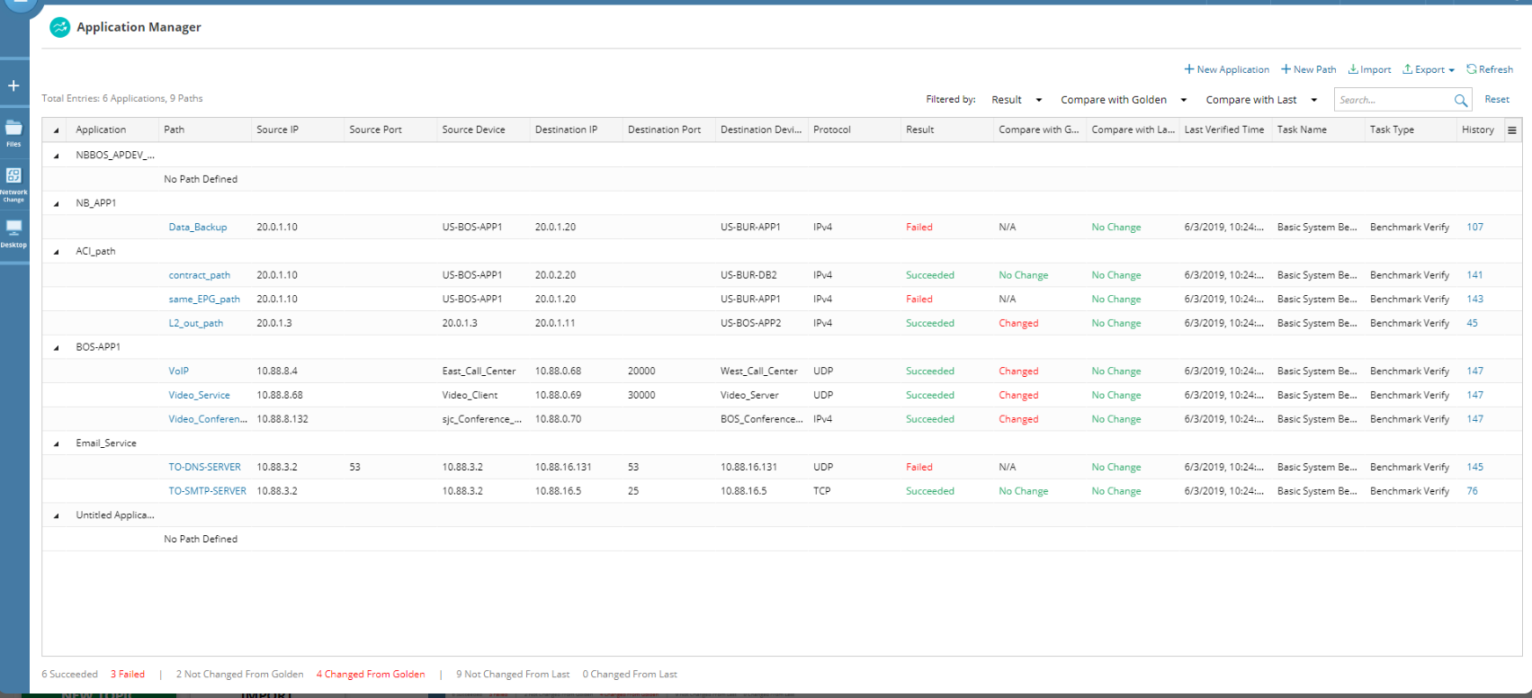 AAM can periodically monitor or verify the application paths and send alerts and emails when paths change. Application paths can be added to a benchmark task so it will be verified when the task is executed. Verification results can be viewed in Application Manager, exported to a CSV file or on a map depicting the differences between the current path and Golden Path.