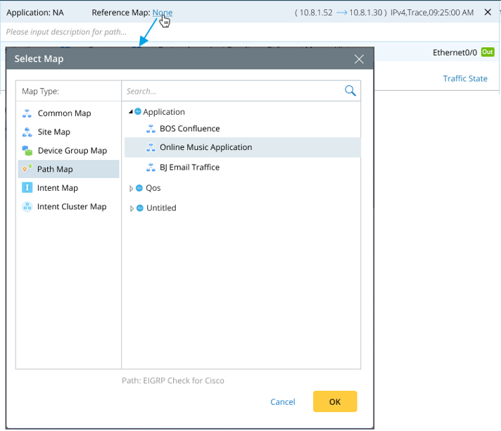 10.1.9 JA Publication Define and View Reference Map You can define a reference map for a saved path. The path reference map allows you to draw the golden baseline path on the map and use device notes to draw key configlets or troubleshooting recommendations on the map. For example: