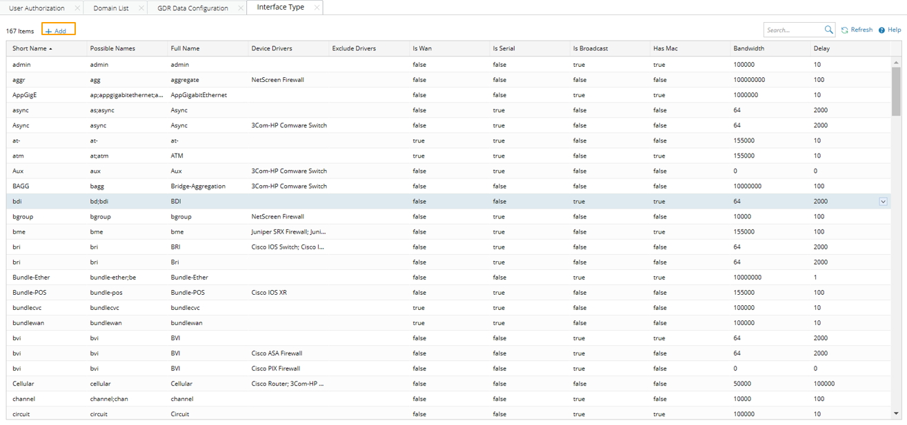 Interface Type is used to manage and define the correspondence between an interface short name and its full name, such as lo equivalent to loopback. When parsing interface data, the system only recognizes the full name of an interface by default. To recognize the short names of interface types, the system maintains an interface type table covering most of the interface types in a network.