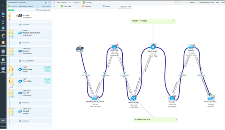 - Select the path on the map and click Monitor to monitor the overall health of the devices along the path.