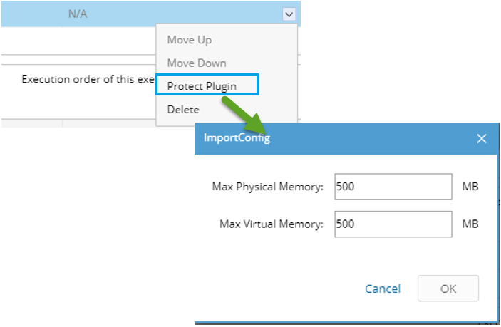 - Define the physical and virtual memory protection for plugins. Right-click a plugin, select Protect Plugin, and enter the maximum memory value to allow executing the plugin. When the predefined memory value is reached, the plugin process will be ended.