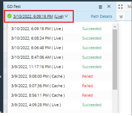 - In the Path Browser, click the number in the History column of the target path entry. A floating box prompts to display all history results of the path by timestamp.