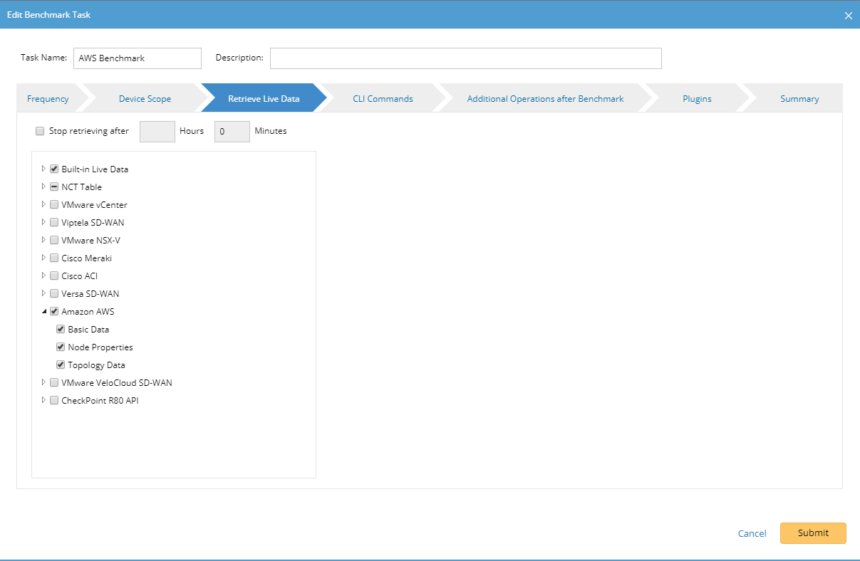 - On the Retrieve Live Data tab, select the Amazon AWS check box, and make sure the following tables (under the NCT table) are selected: