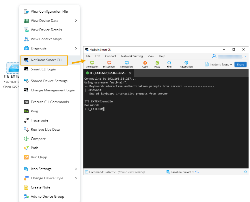 When you use the Smart CLI to connect a device from a map, it will automatically log in to the device with the device's credentials configured in your NetBrain IE.