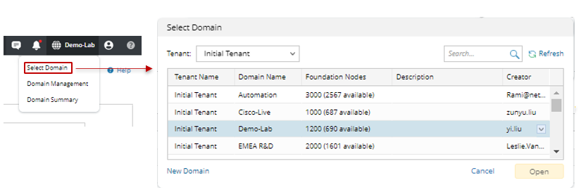 - Click the domain name on the quick access toolbar, then click Select Domain. The pop-up dialog box displays the current domain and tenant you are working on.