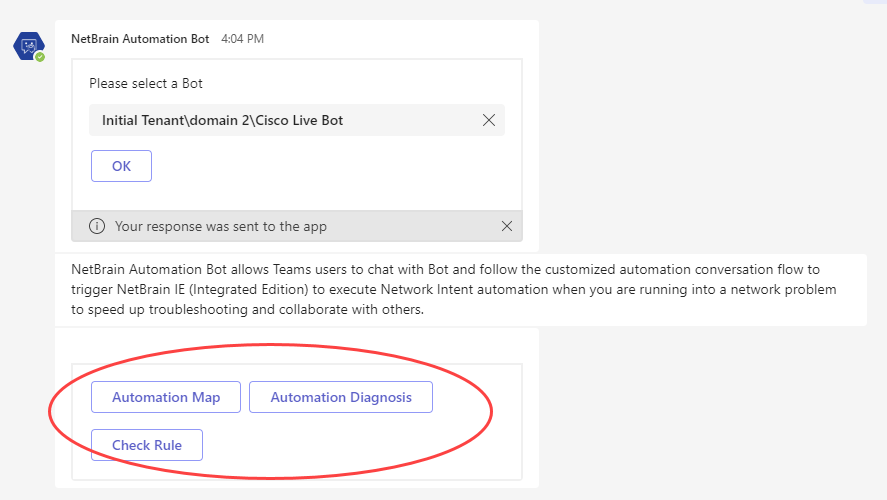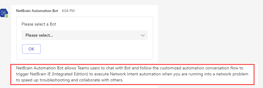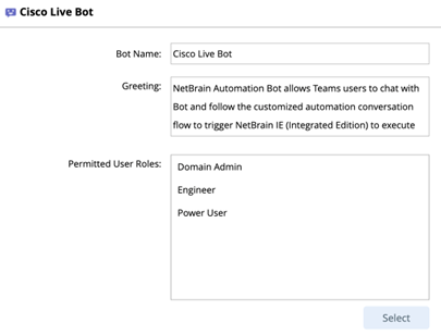 In NetBrain IE In Teams Bot Name End users can see the Bot name when selecting a bot. Greeting End users will see the greetings after selecting this Bot.