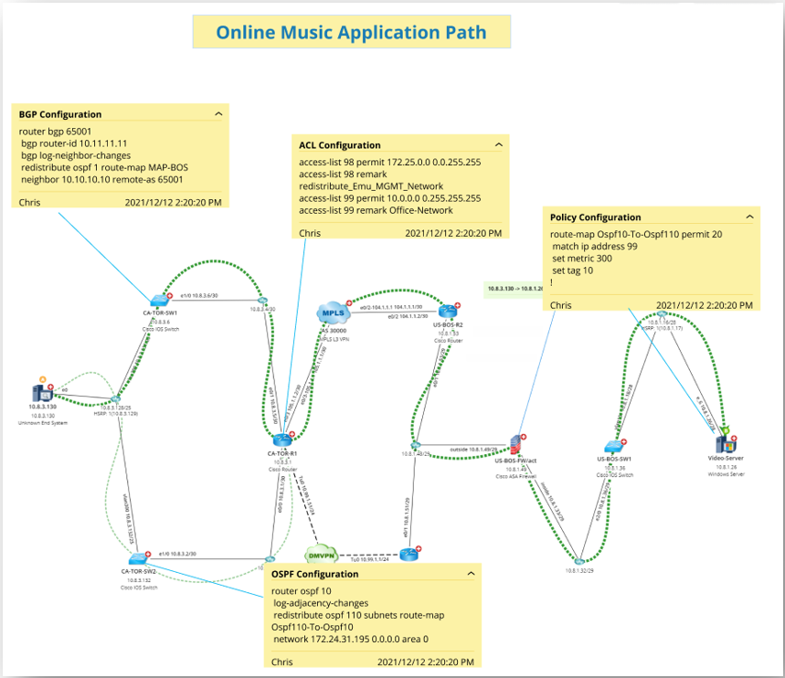 2023-Nov-03-R11.1a Define and View Reference Map You can define a reference map for a saved path. The path reference map allows you to draw the golden baseline path on the map and use device notes to draw key configlets or troubleshooting recommendations on the map. For example: