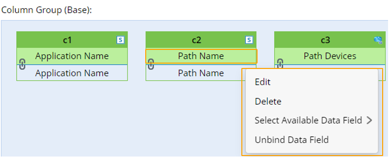 Note: To perform common operations on a column, click corresponding items from the drop-down menu. For example, you can edit, delete the column and bind (Select Available Data Field)/unbind data field to the column.