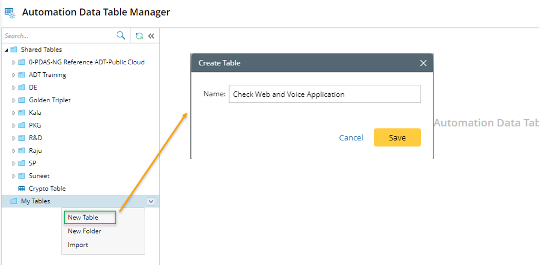 - Open Automation Data Table, then create a new table and name it (for example, "Check Web and Voice Application").
