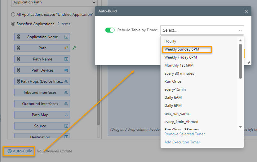 - (Optional) Click Auto-Build to schedule to update table data. In the Auto-build dialog, enable Rebuild Table by Timer, then select a timer (e.g., Weekly Sunday 6PM) from the drop list. For more details, see Auto-Build ADT Data.
