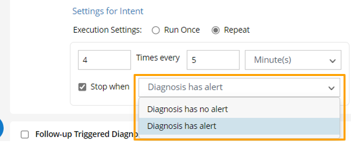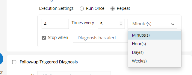 - Repeat: One Diagnosis can run for a fixed number of times at specified intervals by Execution Settings. You can set to run triggered diagnosis to check the issue a few times, making sure there is no transient problem.