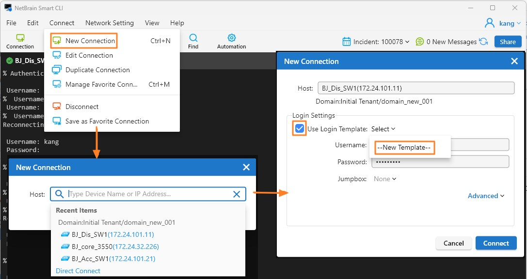 - Enter a device hostname in New Connection dialog. Select the Use Login Template check box and then click New Template from the Select drop-down list.