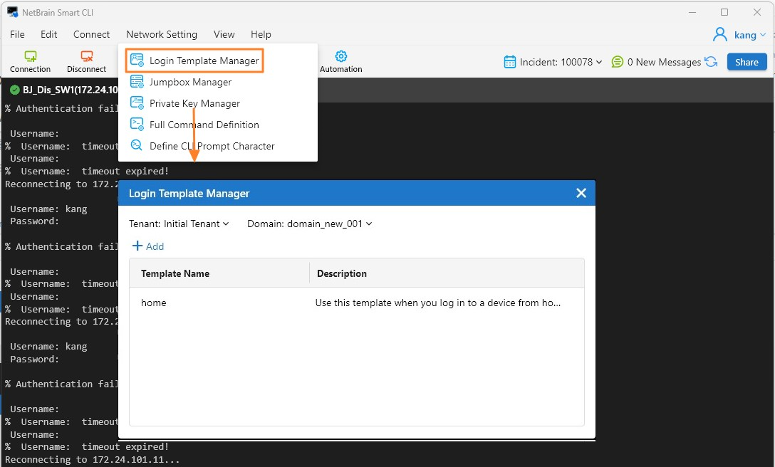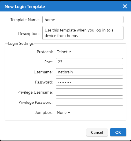 The login template is user-specific at the domain level, storing device-neutral login credentials. You can create multiple login templates to connect a device under different circumstances. Once a login template is defined, you can reuse it for device connection with one click.