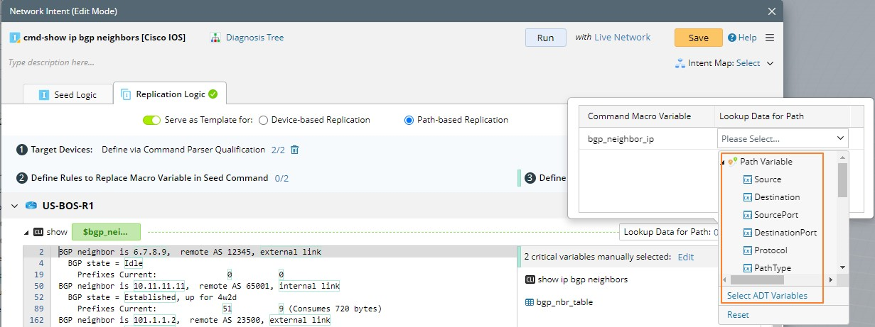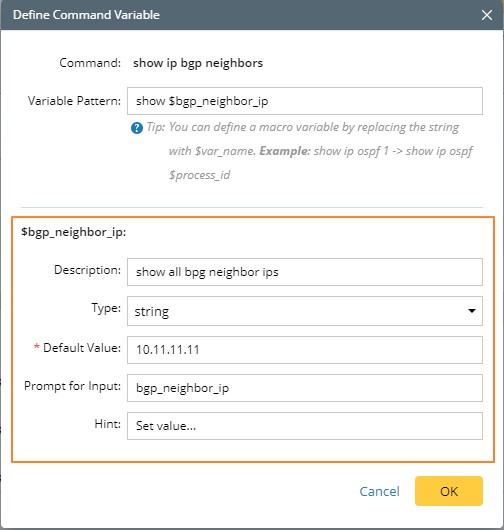 - Define the variable pattern, such as show $bgp_neighbor_ip. Once the variable pattern is defined, more settings are displayed for you to define, such as variable description, variable type, and default value.