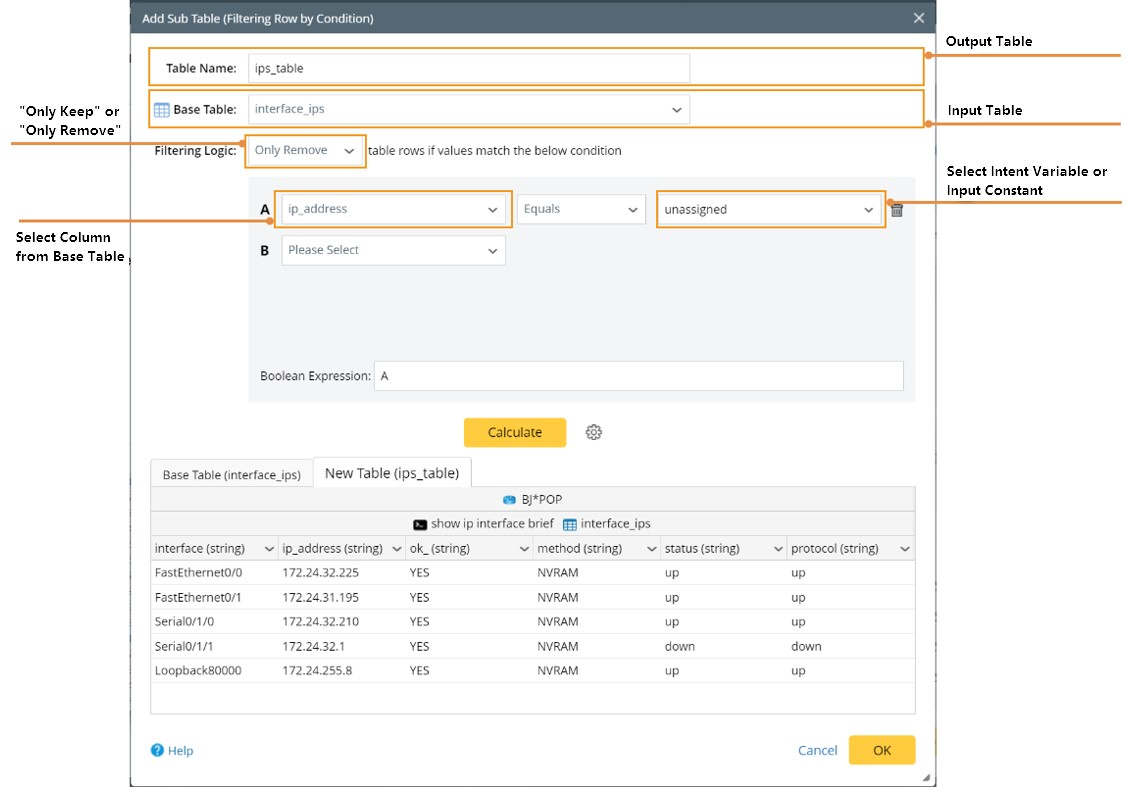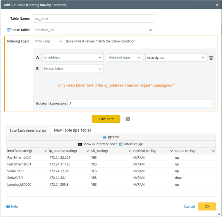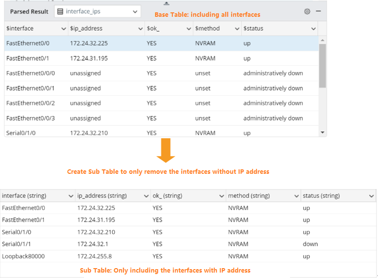 Complete the following steps to use sub table to filter table row by specified condition, for example, create a sub table to only keep the interface with the IP address configured.