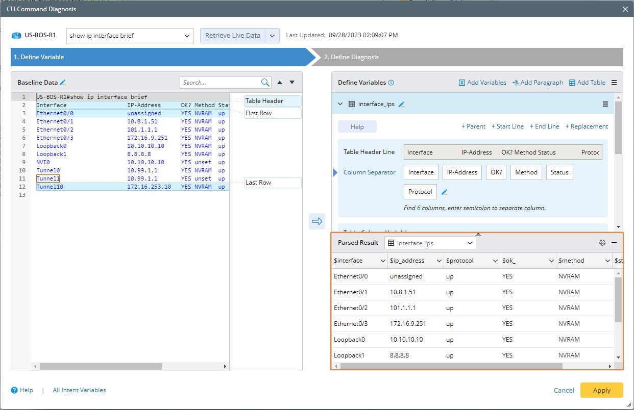 - Build an intent to parse the IP addresses configured on all interfaces on the device via the command show ip interface brief.