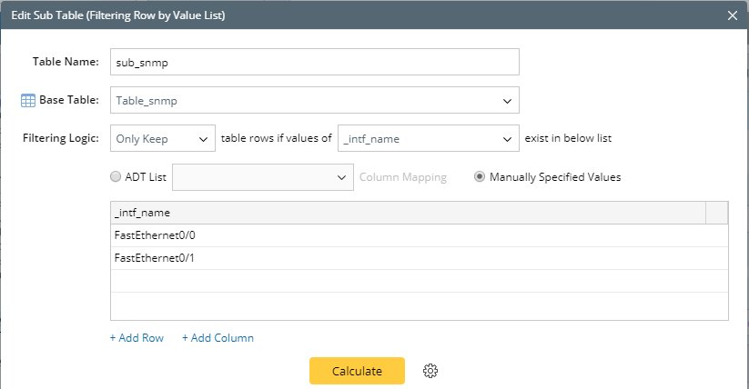 - Filter rows by Predefined ADT List and Manually Specified Values. They are the sources to define the filtered data: the global table or manually defined.