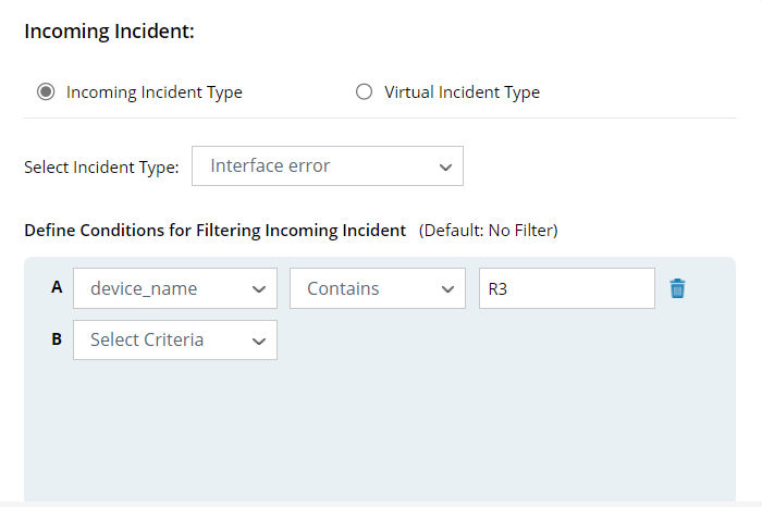 Example: You can select Interface error. All incidents belonging to this incoming incident type can trigger associated ADT intents to run for diagnosis or mapping.