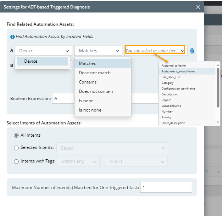 Device contains device_name means the ADT device can be matched if any ADT device’s name contains the value of data field device_name. For example, if the device_name is CA-TOR-R, this ADT assets can be matched because one ADT’s device name is CA-TOR-R1. If you want to match exactly, you can use the operator Matches. - Define Boolean Expression as A or B.