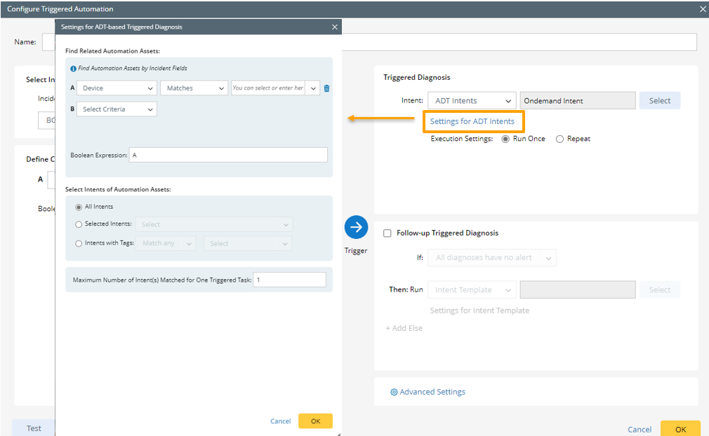 - After ADT intent is selected, the Settings for ADT-based Triggered Diagnosis dialog will pop out, or you can click Settings for ADT Intents to open this dialog.