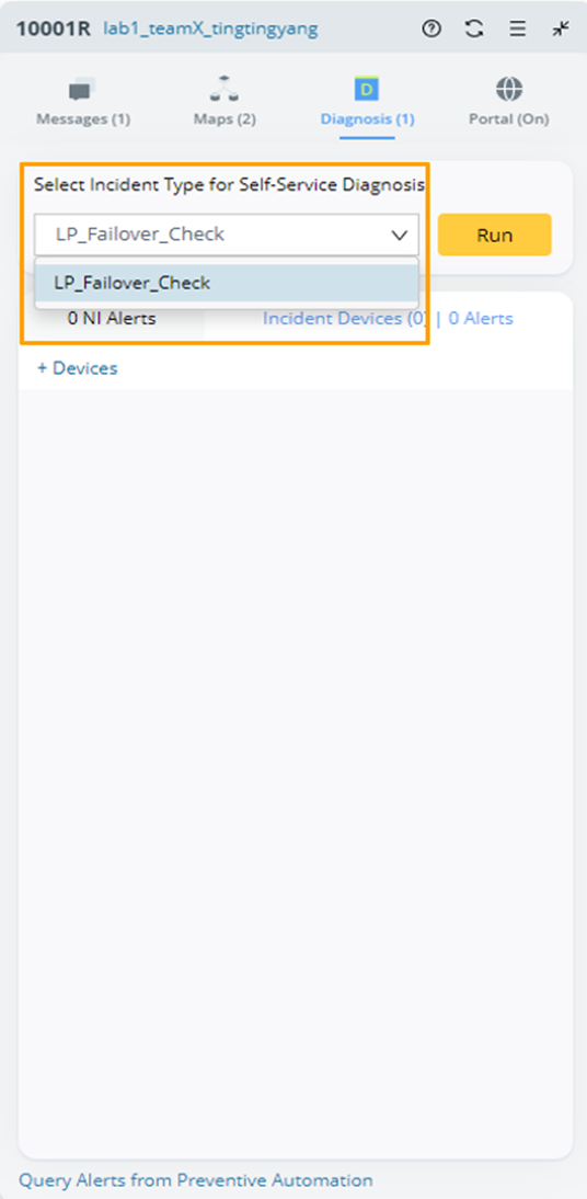 On the Diagnosis tab, you can query alerts from preventive automation, view NI results, and manually run the diagnosis. The Diagnosis pane opens as follows: