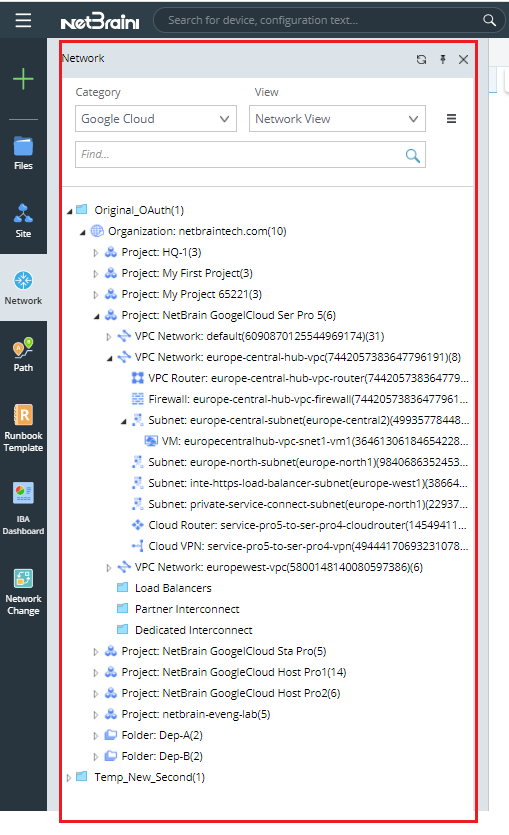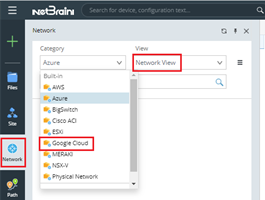 - Open the network tree and select Google Cloud in the Category field to view the GCP resource. Select Network View in the View field.