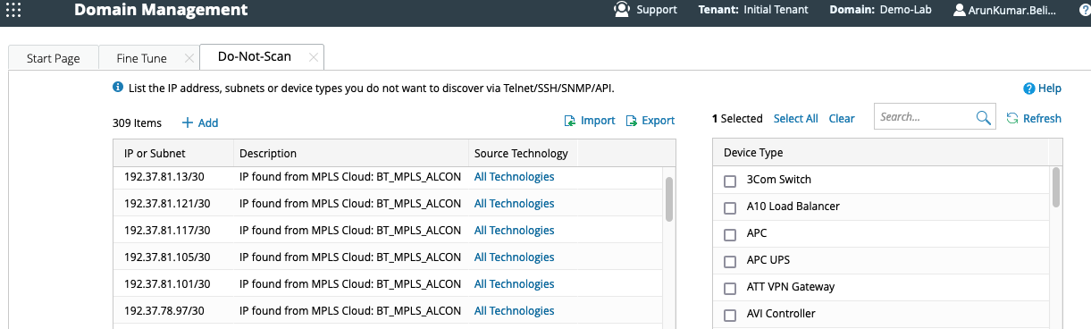 Before discovering a network, you can create a Do-Not-Scan list with specific IP addresses, subnets, or device types that you do not want to discover in your network. Consequently, the related devices are ignored during the discovery process.