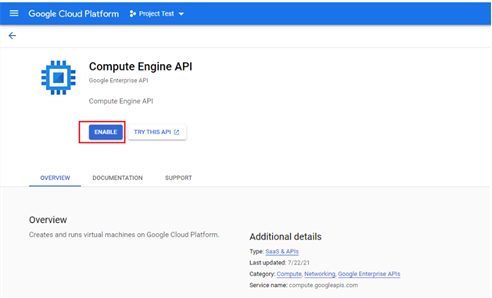 - Select Compute Engine API to open it. Click ENABLE.