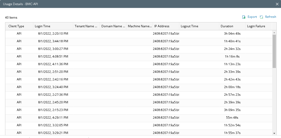 Tip: To browse the detailed user login records, click Check Details in the corresponding entry. The usage details can also be exported by clicking the |