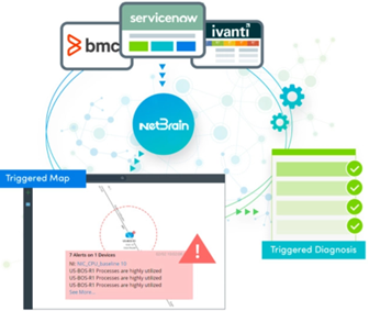 NetBrain Trigger Automation System uses REST APIs to integrate with popular ITSM systems, including ServiceNow and BMC.