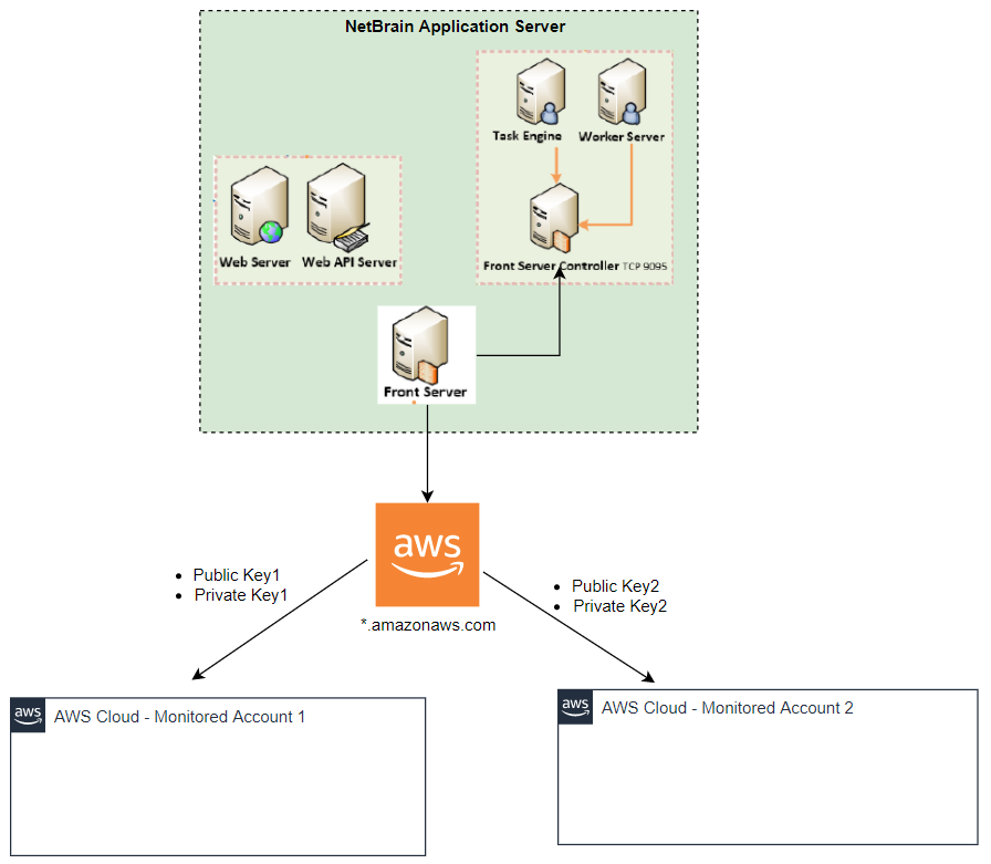 NetBrain requires AWS public key and secrete key to be configured to access the data from AWS for key-based access. NetBrain will use the configured credentials to send HTTP requests via Front Server. Therefore Front Server is required to access the Amazon AWS websites from an Internet access perspective: *.amazonaws.com.