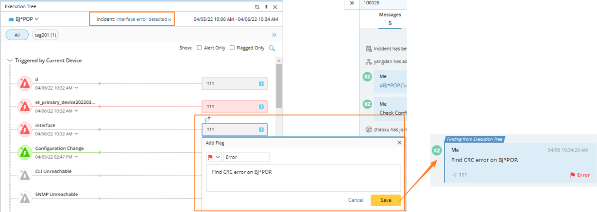 - From PA Dashboard - Execution Tree: you can publish a flagged message to an incident for collaboration. Clicking the link at the lower-left corner of the published message will locate the specific execution tree node.