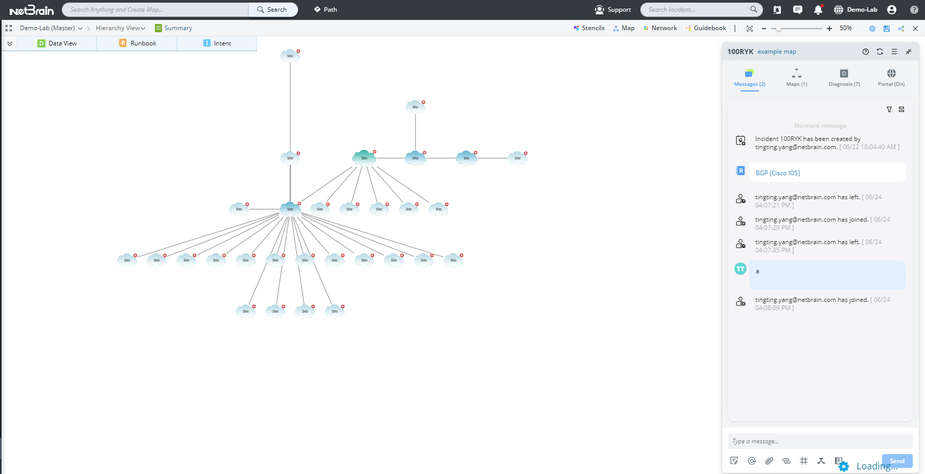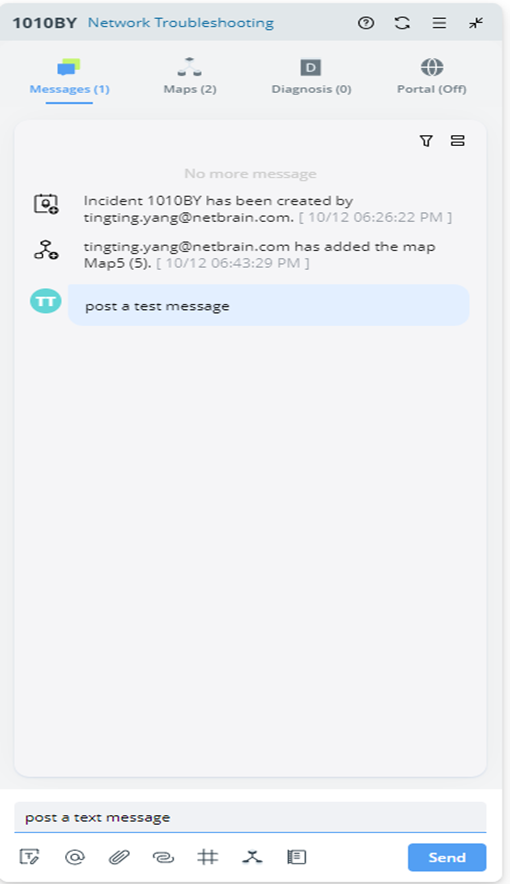 - A pinned message is visible in both the NetBrain system and the incident portal.