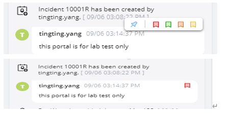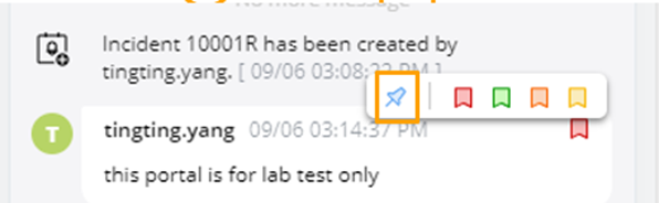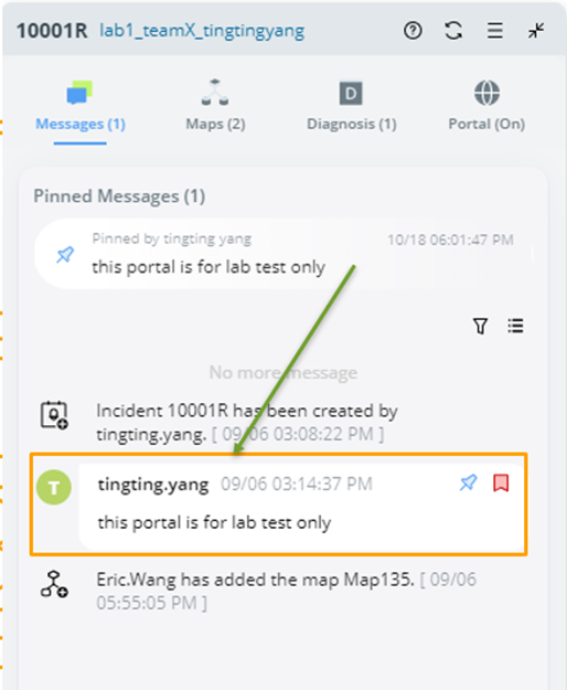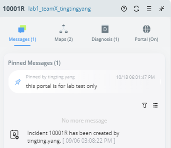 Note: Pinning/unpinning messages are not allowed in an incident portal. Portal users can only view the status of messages in the incident portal. |
