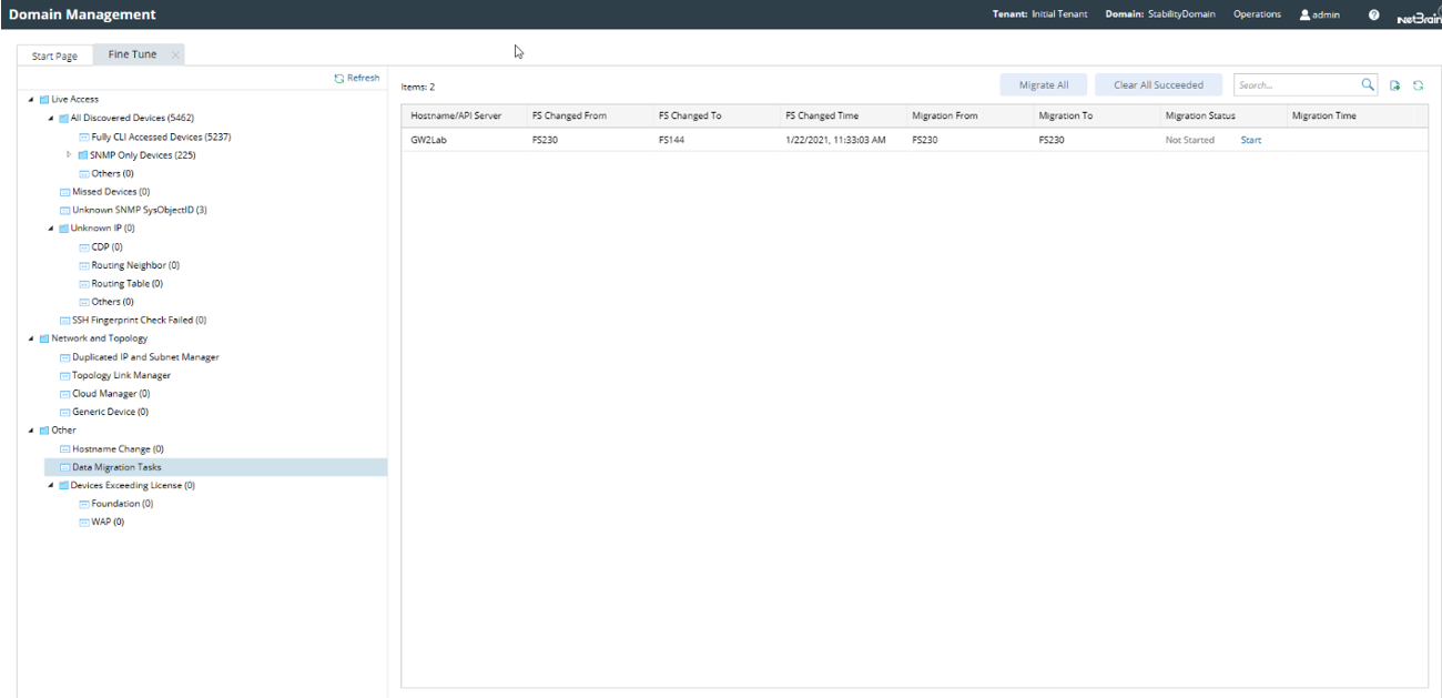 - You can click on Migrate All to migrate all the data for Front Servers; or you can select a specific device from the list and click on Start to migrate the data for individual devices.