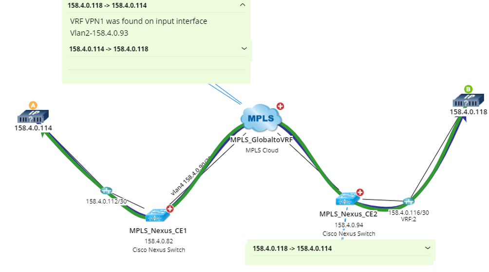 After building the NCT and topology, you can calculate paths across MPLS clouds. During the path calculation, the system looks up the virtual routing table to find the correct inbound and outbound traffic interfaces of the MPLS cloud.
