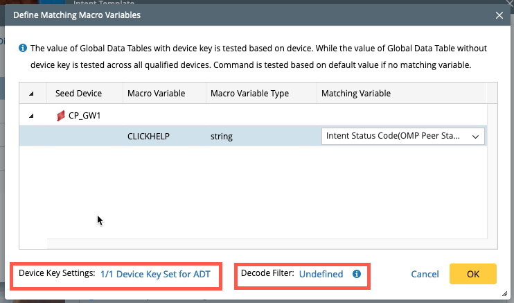 Select the variable and the options Device Key Settings and Decode Filter will appear at the bottom of the Define Matching Macro Variables window.