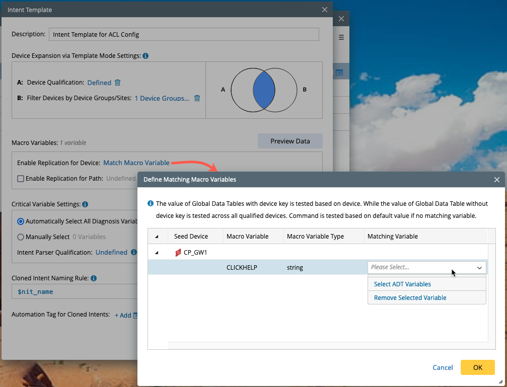 - Define Matching Macro Variable: The value of ADT with device key is tested based on device. The value of ADT without device key is tested across all qualified devices. If there is no matching variable, then the command is tested based on default value.