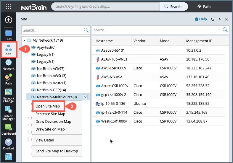 Expand the site tree, right-click the target site and select Open Site Map from the drop-down menu.