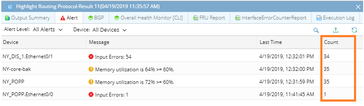 The Alert Output tab shows the events, especially alerts, triggered at both the device and interface levels during a Qapp/Gapp execution. Duplicate alerts are merged into one entry, and the number in the Count column increases by 1.