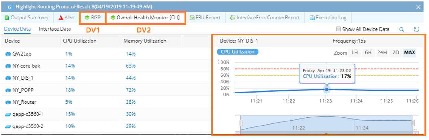The Data View Output tab shows the metrics of devices and interfaces generated when users run a Qapp/Gapp. For numerical metrics, users can view the historical data and trends of a specific metric over a period in a chart.