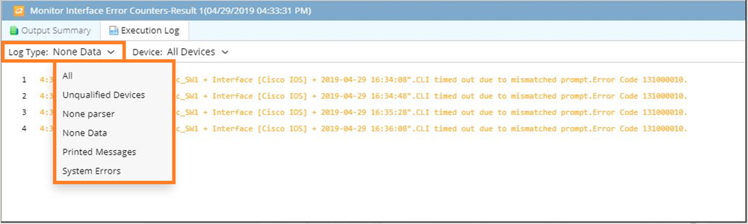 - Execution LogThe Execution Log tab shows the detailed execution logs with error codes for root cause analysis when you run a Qapp/Gapp. It provides filters to narrow down logs based on log types and devices.