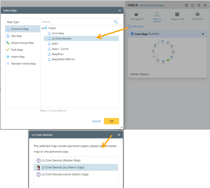 - Option 1: Select a master map first, then select a personal copy in the Map pane.